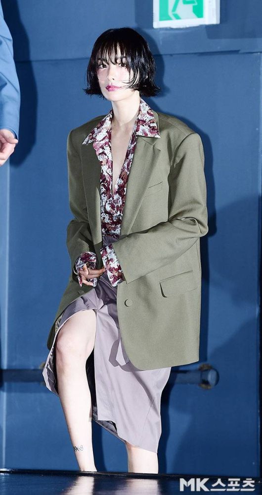 깊은 슬릿이 들어간 그레이 롱스커트는 나나의 각선미를 더욱 극적으로 부각시켰고, 뒷굽이 빨간 포인트 힐은 룩 전체에 ‘예측 불가능한 터치’를 더했다. 단순히 아름답기보다도, 실험적이면서도 구조적으로 완성된 스타일이었다.