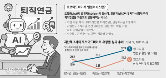 올해 3월 로보어드바이저(AI 로봇이 운영하는 금융서비스) 퇴직연금 일임형 상품이 본격 출시되면서 은행, 증권사, 자산운용사들의 고객 유치 경쟁이 치열해지고 있다. 증권가와 자산운용업계는 AI가 인간의 투자 성과를 압도할 수 있다고 내세우지만 기대만큼 수익률이 높지 않을 수 있다는 지적도 나온다.