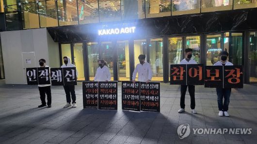 카카오 노동조합인 ‘크루유니언’이 2023년 12월 4일 경기 성남시 카카오아지트에서 인적 쇄신과 크루(직원)의 경영쇄신 참여를 요구하며 피켓 시위를 벌이고 있다. 사진=연합뉴스 |