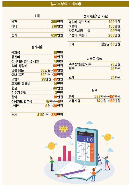이렇게 지출 줄이기가 모두 끝났다. 부부는 용돈 60만원(120만→60만원), 모임비 10만원(25만→10만원), 신용카드 할부금 47만원(47만→0원) 등 117만원을 줄이는 데 성공했다. 여기서 보험료(0원→30만원)를 뺀 뒤 기존 여유자금(82만원)을 더하면 총 169만원의 추가자금을 확보했다는 계산이 나온다.