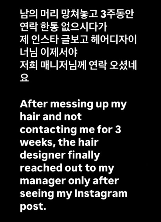 더 충격적인 건, 사고 후 3주 동안 아무런 연락이 없었다는 것. 그는 2차 글을 통해 “인스타 글을 보고 나서야 헤어디자이너 측이 매니저에게 연락을 해왔다”며, 소통 없는 대응에 대한 깊은 실망도 드러냈다. “증모술조차 불가능하다는 말을 들었다”며 절망감 역시 숨기지 않았다.