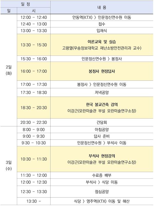 첫째 날에는 고왕열 우송정보대 재난소방안전관리과 교수가 '사찰 화재방재 지침'을 주제로 문화유산 보호를 위한 사찰 및 지역사회 차원의 대응 체계 구축을 강의한다. 고 교수는 목조 건축물이 많은 사찰의 특성상, 화재 예방 수칙과 방재 설비 운용법을 이론과 실습을 통해 설명할 예정이다. 이어 안동 봉정사 현장답사를 통해 화재 위험 요소를 직접 확인하고, 사찰 내 방재 설비의 위치와 사용법 등을 익힌다.