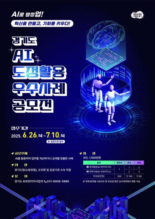 경기도가 생성형 인공지능(AI)을 포함한 인공지능 기술을 행정 전반에 창의적으로 접목한 사례를 발굴하고, 나아가 행정 혁신 문화를 확산하기 위해 'AI 도정활용 우수사례 공모전'을 개최한다.