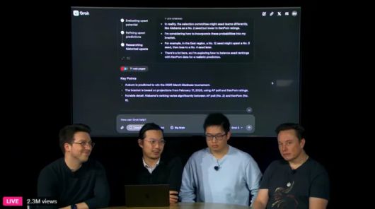 일론 머스크(맨 오른쪽)와 xAI 직원들이 최신 AI 모델 그록3를 설명하는 온라인 영상 캡처. |