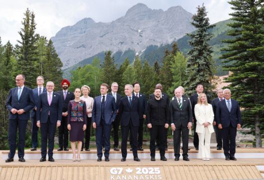 이재명 대통령이 17일(현지시간) 캐나다 앨버타주 캐내내스키스 주요 7개국(G7) 정상회의장에서 의장국 마크 카니 캐나다 총리이시바 시게루 일본 총리 등 G7 및 초청국 정상들과 함께 기념촬영을 하고 있다. 뒷줄 왼쪽부터 시계방향으로 스캇 베센트 미국 재무장관, 아제이 방가 세계은행 총재, 우르줄라 폰데어라이엔 유럽연합(EU) 집행위원장, 키어 스타머 영국 총리, 이 대통령, 시릴 라마포사 남아프리카공화국 대통령, 나렌드라 모디 인도 총리, 이시바 시게루 일본 총리, 안토니우 구테흐스 유엔 사무총장, 안토니우 코스타 유럽연합(EU) 정상회의 상임의장, 조르자 멜로니 이탈리아 총리, 루이스 이나시우 룰라 다시우바 브라질 대통령, 볼로디미르 젤렌스키 우크라이나 대통령, 마크 카니 캐나다 총리, 에마뉘엘 마크롱 프랑스 대통령, 클라우디아 셰인바움 멕시코 대통령, 앤서니 앨버니지 호주 총리, 프리드리히 메르츠 독일 총리. 2025.6.18 |