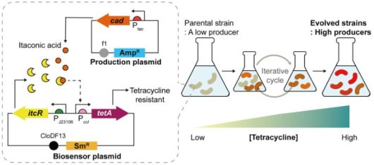 연구팀은 이타콘산을 많이 만들수록 살아남는 조건을 설정해 대장균을 진화시켰다. 이타콘산 농도에 따라 항생제 저항 유전자의 발현량이 달라지도록 설계된 바이오센서를 대장균에 삽입한 것이다. 항생제 농도를 점차 높이며 배양을 반복하면, 이타콘산을 많이 생산하는 대장균만 살아남게 된다.