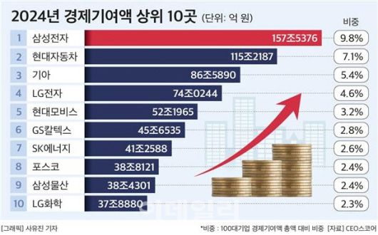개별 기업 중에서는 삼성전자가 1위를 차지했다. 삼성전자의 지난해 경제 기여액은 157조5376억원으로 전년(147조1710억원) 대비 7.0% 늘었다. 100대 기업 전체 경제 기여액에서 삼성전자가 차지하는 비중도 2023년 9.5%에서 2024년 9.8%로 0.3%포인트 상승했다.