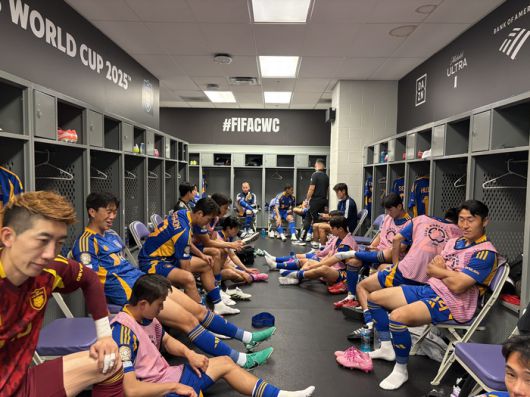울산HD 선수들이 마멜로디 선다운스(남아프리카공화국)와 국제축구연맹(FIFA) 클럽월드컵 첫판을 앞두고 낙뢰 변수로 킥오프가 미뤄진 뒤 라커룸에서 대기하고 있다. 사진 | 울산HD |