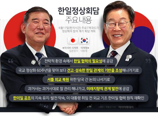아시아투데이 이충재 기자 = 17일(현지시각) 이재명 대통령과 이시바 시게루 일본 총리가 마주 앉은 정상회담 테이블에 오른 메인 메뉴는 '경제협력'이었다. 보호무역주의의 확산, 공급망 분절 등 글로벌 통상질서 대전환기의 환경 속에서 '이웃'이 함께 손잡고 위기를 극복해야 한다는 공감대를 넓혔다. 한일 정상회담은 주요 7개국(G7) 정상회의가 열리는 캐나다 카나나스키스 정상회의장에서 30분간 진행됐다.