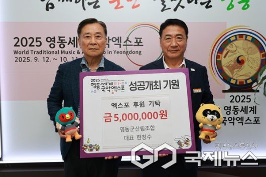 (영동=국제뉴스) 이재기 기자 = 충북 영동군 산림조합(조합장 한창수)은 18일 영동군청에서 2025 영동세계국악엑스포의 성공 개최를 기원하며 성금 500만 원을 기탁했다.