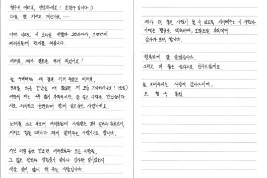 조형우는 손편지를 통해 "여전히 저는 너무 많이 부족하지만, 참 좋은 사람을 만났습니다. 서로 의지하고 응원하며 함께 살고 싶은 사람이에요. 노래를 쓰고 부르며 여러분들께 사랑받는 것이 얼마나 축복인지 지치고 힘들 때마다 제게 알려주는 사람이기도 합니다"라고 예비 신부인 김윤의 작가를 소개했다.