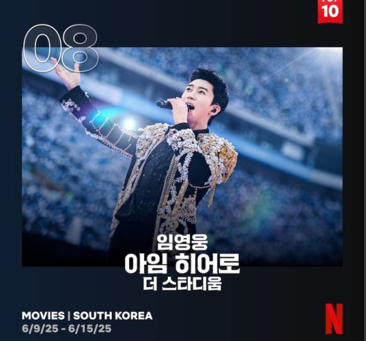 [스포츠서울 | 배우근 기자] 가수 임영웅 콘서트 영화가 넷플릭스에서 또다시 대한민국 톱8에 오르면서 꾸준한 인기를 이어가고 있다.