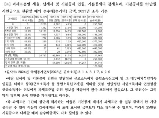 아래 표는 과세표준 구간별 세율 및 해당인원과 150만 원 기본공제로 인한 감세액과 기본공제 대신 25만 원 현금(기본소득) 지급시의 순수혜 또는 순기여 금액을 나타낸다. 과세표준이 높을수록 150만 원 기본공제로 인한 감세액이 커져 과세표준 5천만 원 초과자는 기본공제 감세액이 25만 원보다 더 높다. 따라서 기본공제를 25만 원의 현금 지급으로 전환하면 과세표준 5천만 원을 초과하는 납세자와 그 부양가족에 속하는 15.1%의 인구는 순기여자가 된다. 다만, 이들의 소득에서 순기여금액이 차지하는 비중은 기껏해야 0.2%에서 0.1% 미만에 불과하다.