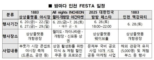 특히 올해는 그동안 각각 개최됐던 ‘1883 상상플랫폼 야시장’, ‘1883 인천 맥강파티’, ‘All nights INCHEON 월미·개항장 야간마켓’, ‘2025 대한민국 밤밤 페스타’ 등을 통합해 개최한다.