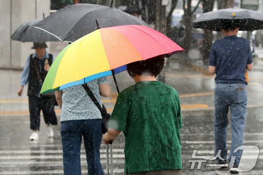 16일 오전 대구 수성구 달구벌대로에 많은 비가 쏟아지자 시민들이 우산을 펼쳐 비를 피하며 길을 건너고 있다. 2025.6.16/뉴스1 ⓒ News1 공정식 기자 |