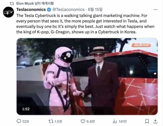 일론 머스크는 최근 지드래곤의 사이버트럭 탑승 영상을 리트윗, “K-팝의 제왕 지드래곤이 사이버트럭을 타고 한국에 나타나면 어떤 일이 벌어질지 지켜보세요(Just watch what happens when the king of K-pop, G-Dragon, shows up in a Cybertruck in Korea)”라는 문구와 함께 사이버트럭에서 내리는 지드래곤의 모습이 담긴 영상을 올렸다. 이 영상은 일론 머스크가 리트윗해 17일 기준 조회수 139만을 돌파했다.