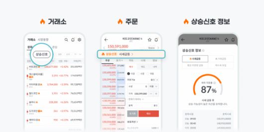 상승신호 서비스는 빗썸 원화마켓에서 제공되며, 상승신호가 감지된 종목은 거래소 화면 내 가상자산 리스트에서 불꽃 아이콘이 가상자산명 옆에 표기된다. 상승신호 테마를 선택하면, 해당 신호가 포착된 종목만 따로 확인도 가능하며, 알림 설정을 통해 실시간 알림 수신도 가능하다.