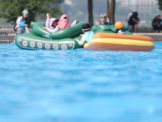 1일 서울 광진구 뚝섬한강공원에서 열린 '제2회 쉬엄쉬엄 한강 3종 축제'에서 아이들이 물놀이를 하고 있다. 연합뉴스 |