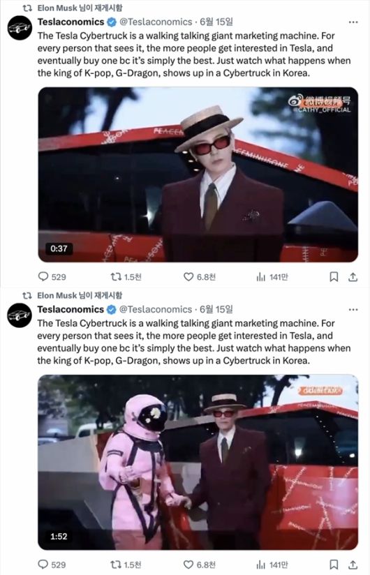 그런 가운데 테슬라 최고경영자(CEO)인 일론 머스크가 G-DRAGON의 사이버트럭 탑승 영상을 리트윗해 화제를 모으고 있다. 그가 리트윗한 ‘Teslaconomics’의 게시물에는 “K-Pop의 제왕 지드래곤이 사이버트럭을 타고 한국에 나타나면 어떤 일이 벌어질지 지켜보세요(Just watch what happens when the king of K-pop, G-Dragon, shows up in a Cybertruck in Korea)”라는 문구와 함께 사이버트럭에서 내려 행사장으로 들어서는 G-DRAGON의 모습이 담겨있다. 해당 영상은 일론 머스크가 리트윗함으로써 17일 기준 조회수 139만을 돌파하며 폭발적인 반응을 자아내고 있다.