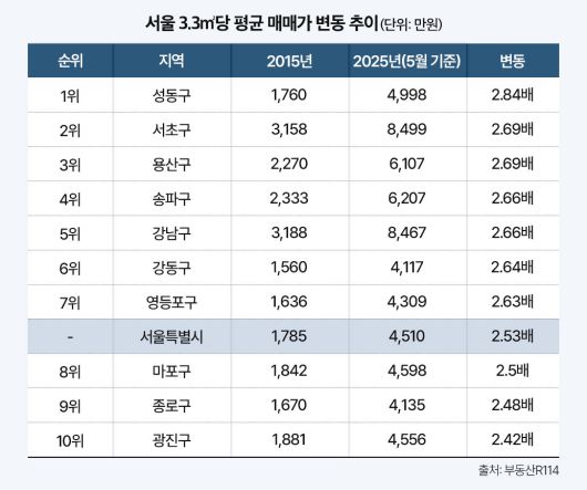 서울 자치구 중 10년간 가장 높은 상승률을 보인 곳은 성동구였다. 3.3㎡당 평균 매매가격이 1760만 원에서 4998만 원으로 2.84배 올랐다. 이어 서초구 2.69배, 용산구 2.69배, 송파구 2.66배, 강남구 2.66배, 강동구 2.64배 순이었다. 이들 6개 지역 모두 최근 서울 집값 상승을 주도해온 주요 권역에 포함돼 있다.