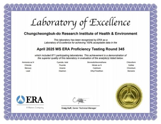 [청주=뉴스핌] 백운학 기자 = 충북보건환경연구원이 미국 환경자원학회(ERA)가 주관한 2025년 먹는 물 분야 국제 숙련도 시험에 참가해 9년 연속으로 국제 인증을 획득했다.
