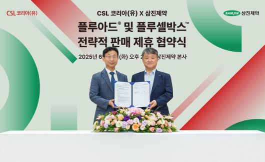 [서울=뉴시스]이승주 기자 = 삼진제약이 글로벌 백신 기업 CSL시퀴러스코리아와 면역증강 인플루엔자 백신 '플루아드'와 세포배양 인플루엔자 백신 '플루셀박스' 국내 유통 협약을 맺었다.