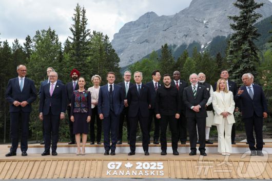이재명 대통령이 17일(현지시간) 캐나다 앨버타주 캐내내스키스 주요 7개국(G7) 정상회의장에서 의장국 마크 카니 캐나다 총리이시바 시게루 일본 총리 등 G7 및 초청국 정상들과 함께 기념촬영을 하고 있다. ⓒ 로이터=뉴스1 ⓒ News1 송원영 기자 |