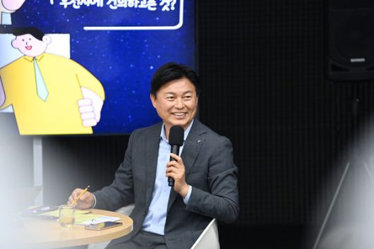 조용익 부천시장이 지난 6월 13일 유한대학교에서 열린 영톡스클럽에서 청년들과 대화를 나누고 있다. [사진=부천시] |