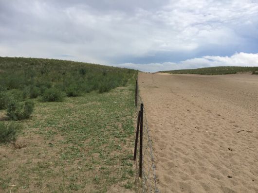 중국 내몽골자치구 후룬베이얼 사막화 방지 조림사업지_조림사업지 울타리 내외 비교 (사진=국립산림과학원) |