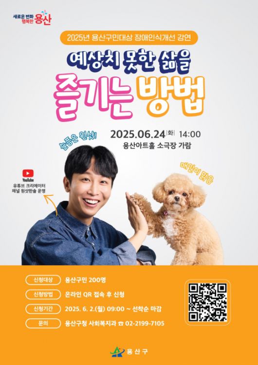 김한솔 강사는 구독자 145만 명을 보유한 유튜브 채널 운영자로, 저서 ‘슬픔은 원샷, 매일이 맑음’ 등을 펴냈다. 보건복지부 장애인식개선 전문강사로 위촉돼 활동하였으며, 한국점자의 날 영상 부문 대상을 수상했다. 강연은 무료로 진행되고 용산구민이면 누구나 참여할 수 있다.