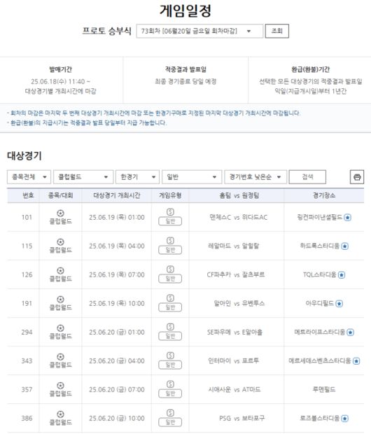 한편 2025 FIFA 클럽 월드컵을 대상으로 하는 프로토 승부식 73회차의 다양한 유형과 관련한 상세한 정보는 공식 인터넷 발매사이트 베트맨 내 토토가이드 페이지에서 확인할 수 있다.