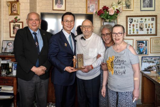 파리에어쇼 참가차 프랑스를 방문 중인 신익현(왼쪽 두 번째) 대표는 지난 16일(현지시간) UN군 참전용사 세르주 아르샹보(오른쪽 두 번째) 씨의 자택을 찾아, 감사패와 기념품을 전달하며 대한민국의 자유와 평화를 위해 싸운 참전용사의 숭고한 희생을 기렸다.