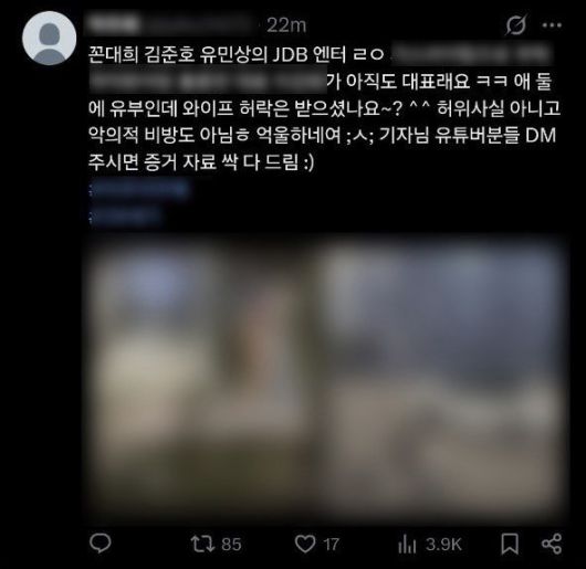 폭로자는 사생팬으로 추정된다. A 대표는 사진을 근거로 장소를 특정했다. 근처 CCTV 영상을 확보해 경찰에 전달한 것으로 전해졌다. JDB도 폭로자를 수사해달라고 고발장을 제출했다.