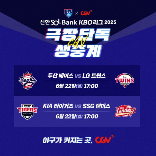 CGV는 오는 6월 22일 오후 5시에 펼쳐지는 ‘두산 베어스 vs LG 트윈스’ 경기와 ‘KIA 타이거즈 vs SSG 랜더스’ 경기를 생중계한다고 18일 밝혔다.