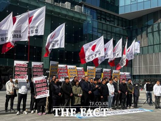 전국민주노동조합총연맹 전국화학섬유식품산업노동조합 카카오지회(크루유니언)가 지난 3월 경기 성남 카카오 판교아지트 앞에서 카카오의 콘텐츠 사내독립기업(CIC) 분사 반대와 임금·단체협약 교섭 거부에 대한 시정을 촉구하는 기자회견을 열고 있다. /조소현 기자 |