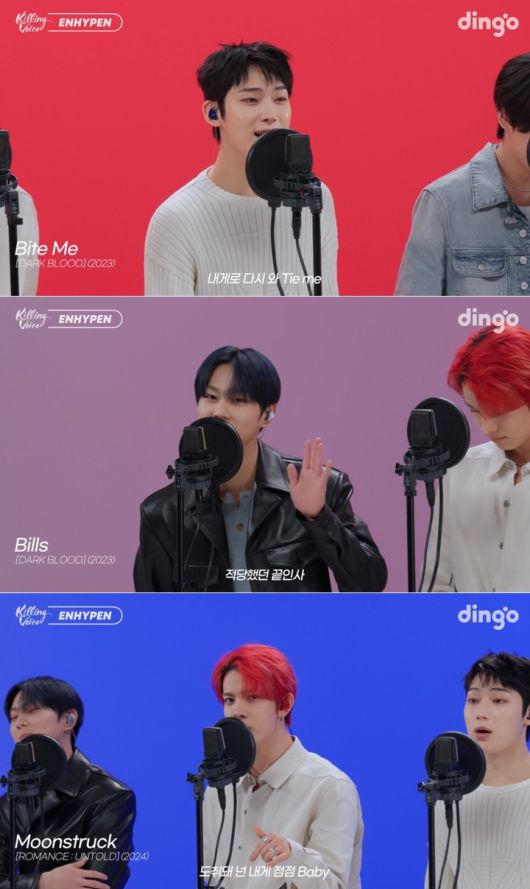 공개된 영상 속에서 엔하이픈은 "어렸을 때부터 딩고 '킬링 보이스'를 좋아했었는데 나오게 되어 기쁘다. 초대해 주셔서 감사하다"라며 반가운 인사를 전한 뒤, 다크 판타지의 정수를 담은 '바이트 미(Bite Me)'로 '킬링 보이스'의 오프닝을 화려하게 열었다.