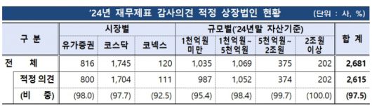 18일 금융감독원이 발표한 '2024 회계연도 상장법인 재무제표와 내부회계관리제도 감사의견 분석'에 따르면 재무제표 감사의견이 '적정'인 상장사는 분석 대상 2681개사 중 2615개사(97%)였다. 2019년 신외감법 시행 이후 큰 변동 없이 97% 수준을 유지했다.