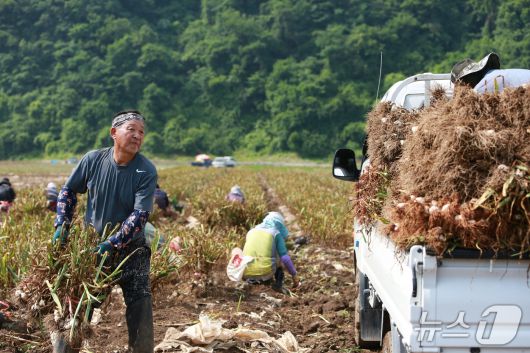 농민들이 단양군 어상천면의 한 마늘밭에서 마늘을 옮기고 있다.2025.6.18./뉴스1 ⓒ News1 손도언 기자 |