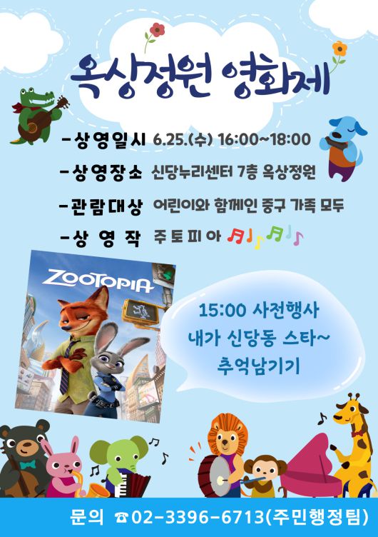 이번 영화제는 신당누리센터 7층 옥상정원에서 정기적으로 영화를 상영해 주민들에게 일상 속 활력을 제공하고 주민 소통의 장을 마련해 지역 공동체 형성을 돕기 위한 목적으로 꾸며진다.