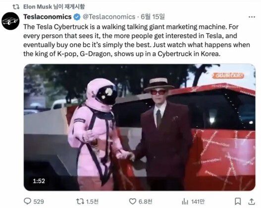 게시물에는 ‘K-POP’의 제왕 지드래곤이 사이버트럭을 타고 한국에 나타나면 어떤 일이 벌어질지 지켜보세요(Just watch what happens when the king of K-pop, G-Dragon, shows up in a Cybertruck in Korea)’라는 내용의 코멘트도 함께였다.