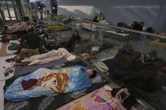 17일(현지시간) 대피소로 사용되고 있는 이스라엘 텔아비브의 한 지하철역에서 사람들이 휴식을 취하고 있다. AP연합뉴스 |