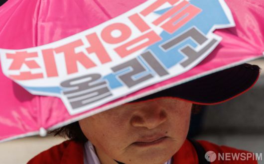 [서울=뉴스핌] 윤창빈 기자 = 서비스연맹 전국돌봄서비스노동조합이 18일 오후 서울 여의도 국회 본청 앞 계단에서 6.18 돌봄노동자 하루멈춤의 날 최저임금 대폭 인상 촉구, 돌봄노동자 하루멈춤 투쟁 기자회견을 열 피켓을 양산에 붙이고 있다. 2025.06.18 pangbin@newspim.com