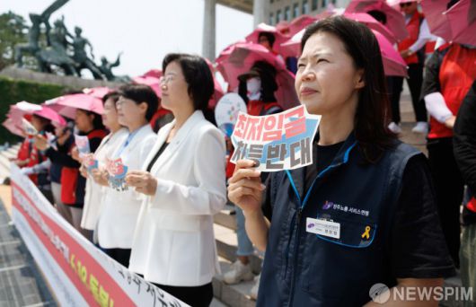 [서울=뉴스핌] 윤창빈 기자 = 서비스연맹 전국돌봄서비스노동조합이 18일 오후 서울 여의도 국회 본청 앞 계단에서 6.18 돌봄노동자 하루멈춤의 날 최저임금 대폭 인상 촉구, 돌봄노동자 하루멈춤 투쟁 기자회견을 열 피켓을 들고 있다. 2025.06.18 pangbin@newspim.com