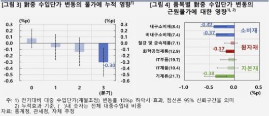 한은은 미국 경제학자인 기타 고피나스(Gopinath)가 사용한 방법론을 원용해 대(對)중 수입단가의 국내물가 전가 효과를 추정한 결과, 수입단가가 10%포인트 하락할 경우 1년에 걸쳐 국내 근원물가(식료품·에너지 제외) 상승률이 0.3%포인트 하락하는 것으로 추정했다. 근원물가 품목과 직접 관련이 있는 소비재 수입단가 하락폭이 상대적으로 컸다.