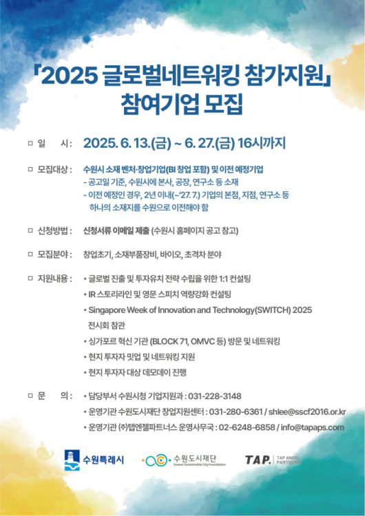 [수원=뉴스핌] 박노훈 기자 = 수원특례시는 '2025 글로벌네트워킹 프로그램'에 참여할 관내 스타트업 7개 사를 모집한다고 18일 밝혔다.