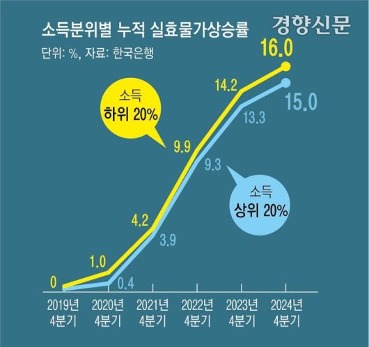 특히 생활물가 상승으로 인플레이션 불평등이 심화되면서 저소득층의 생활비 부담이 더 커졌다. 2019년 4분기부터 지난해 4분기까지 누적 실효 물가상승률을 보면 소득하위 20%가 16.0%로 소득상위 20%(15.0%)보다 높았다. 고물가 충격은 저소득층이 더 컸다는 뜻이다.