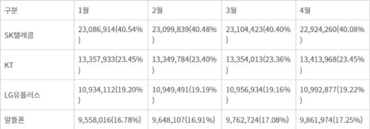 4월 전체 통신시장의 점유율은 SK텔레콤 40.08%, KT 23.45%, LG유플러스 19.22%, 알뜰폰 17.25%를 각각 기록했다.
