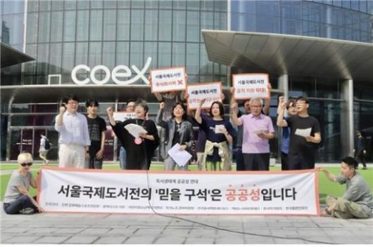 독서생태계 공공성 연대가 18일 오전 서울국제도서전이 열리는 서울 강남 코엑스의 동문 앞에서 기자회견을 개최하고, "서울국제도서전의 '믿을 구석'은 공공성이다"라는 구호 아래 도서전의 '주식회사화', '사유화', '영리화' 시도를 강력 규탄했다.