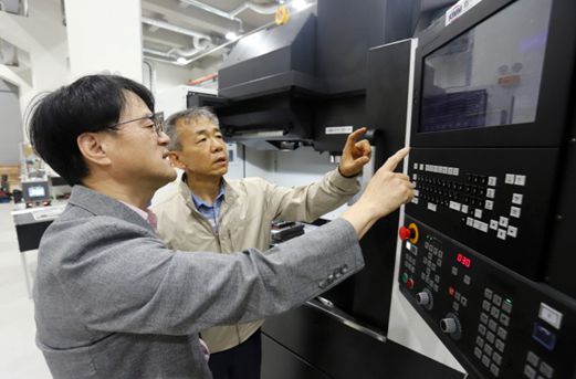 송창규 기계연 책임연구원(왼쪽)이 K-CNC 시스템을 살펴보고 있다. [사진=기계연] |