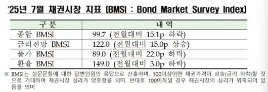 금융투자협회(금투협)가 18일 '2025년 7월 채권시장지표(BMSI)'에서 종합 BMSI가 전월 대비 15.1p(포인트) 하락한 99.7이라고 밝혔다.
